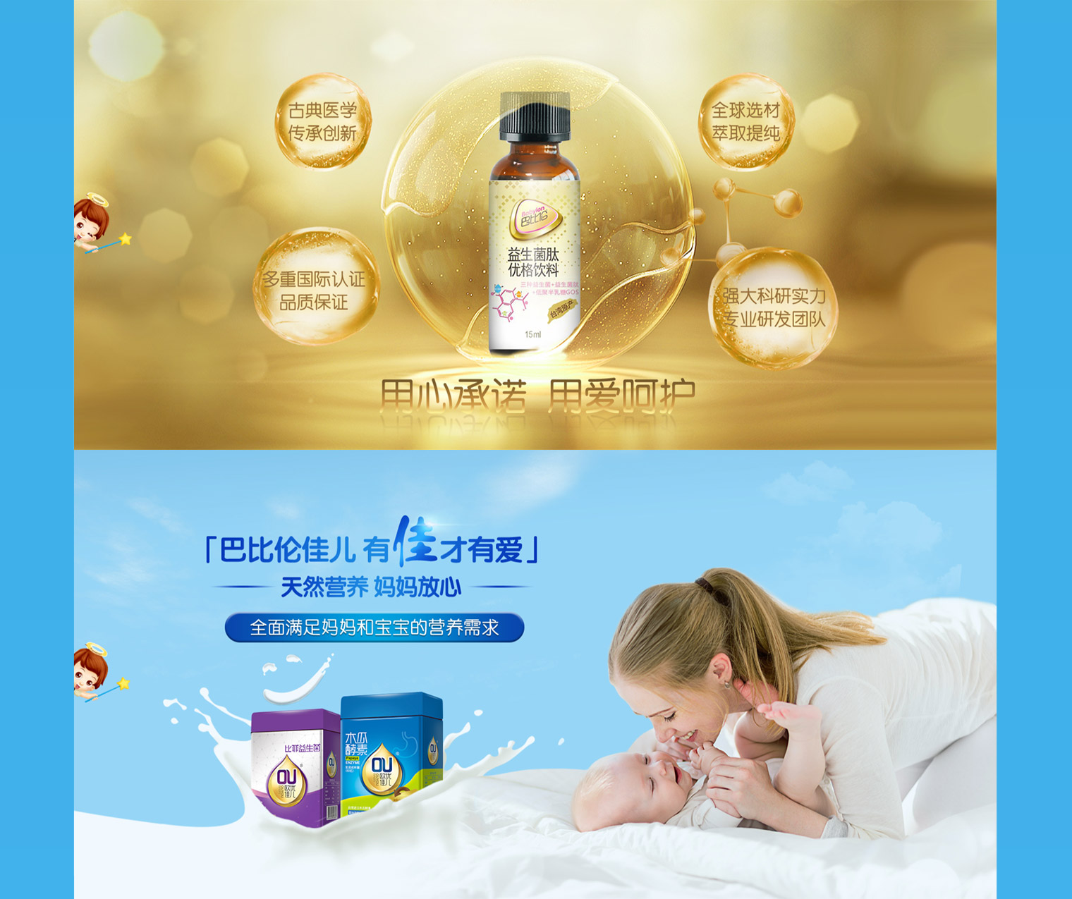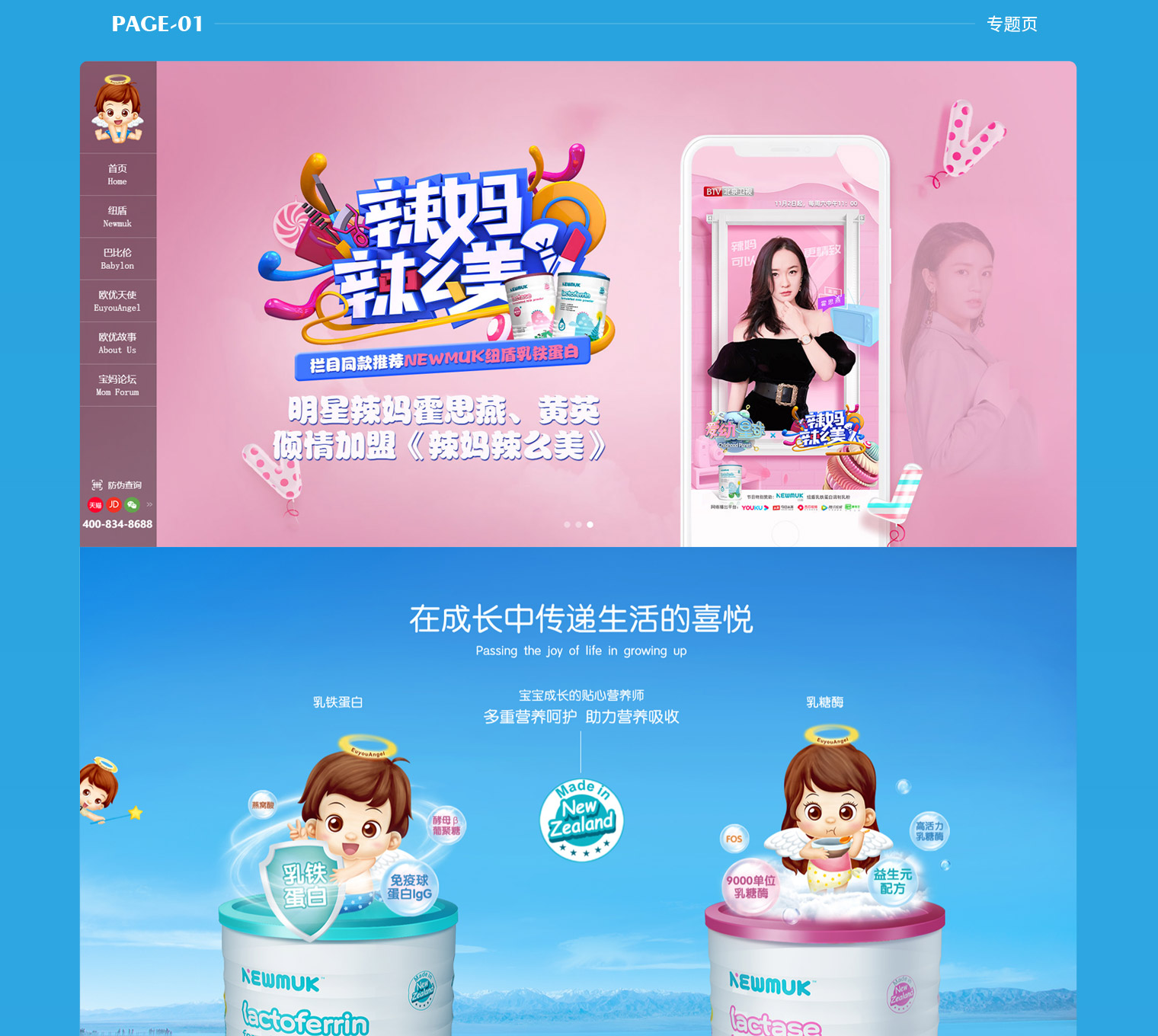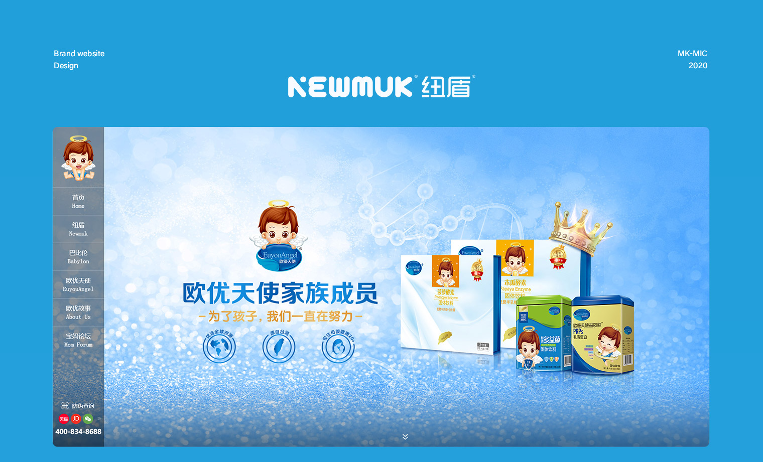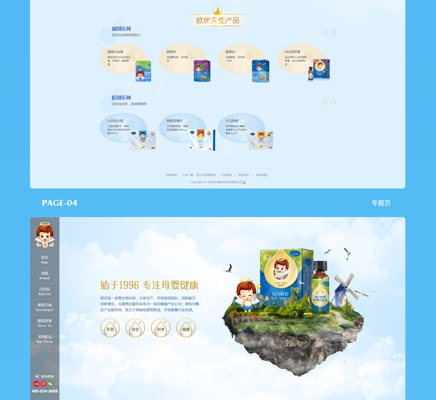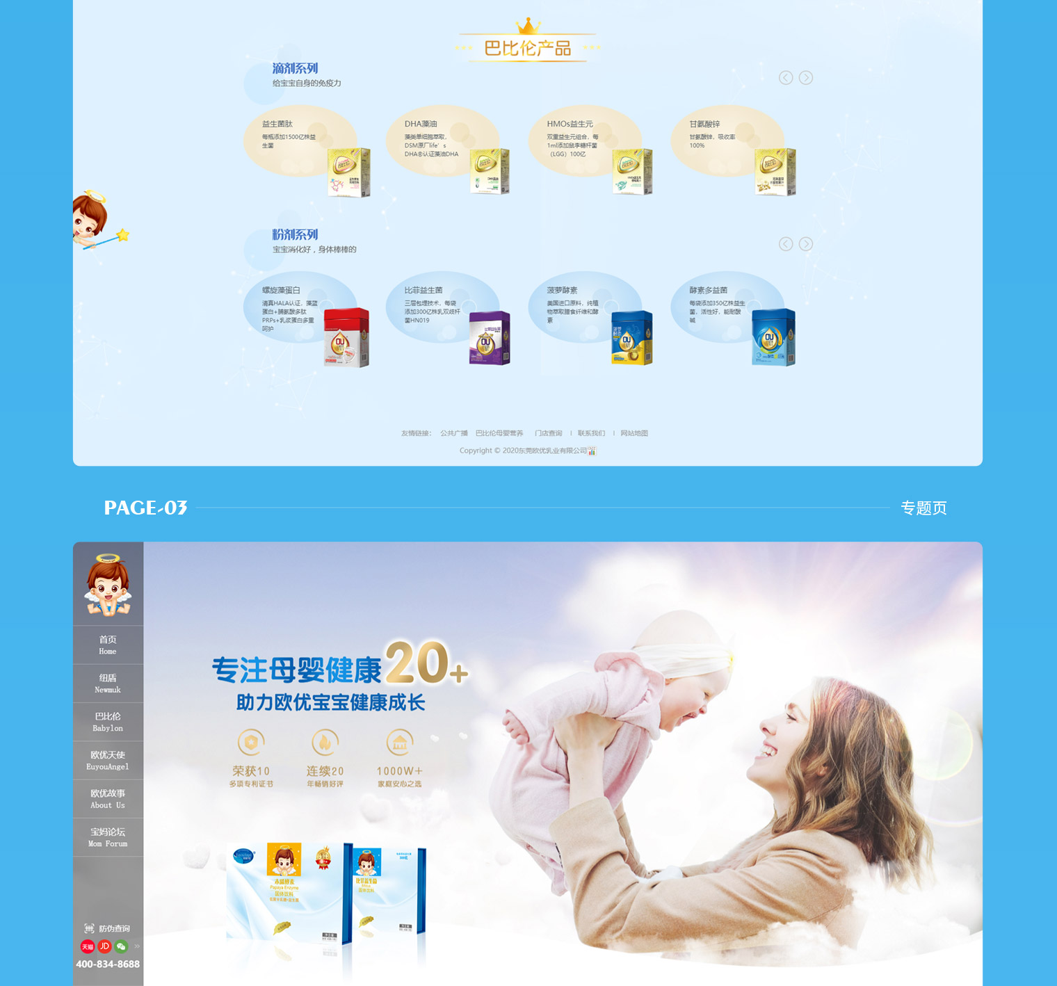 欧优乳业多品牌网站建设,网站主要以品牌传递为主,让用户群体进入网站第一眼提升对欧优乳业的品牌认识,通过网站同时展示旗下3大品牌“纽盾”“巴比伦”“欧优天使”,对每个品牌进行独立介绍及展示,每个品牌根据产品类型不同进行独立的UI风格设计,整站采用响应式H5制作,自适应电脑、手机、平台,同时具备门店检查及宝妈交流功能。